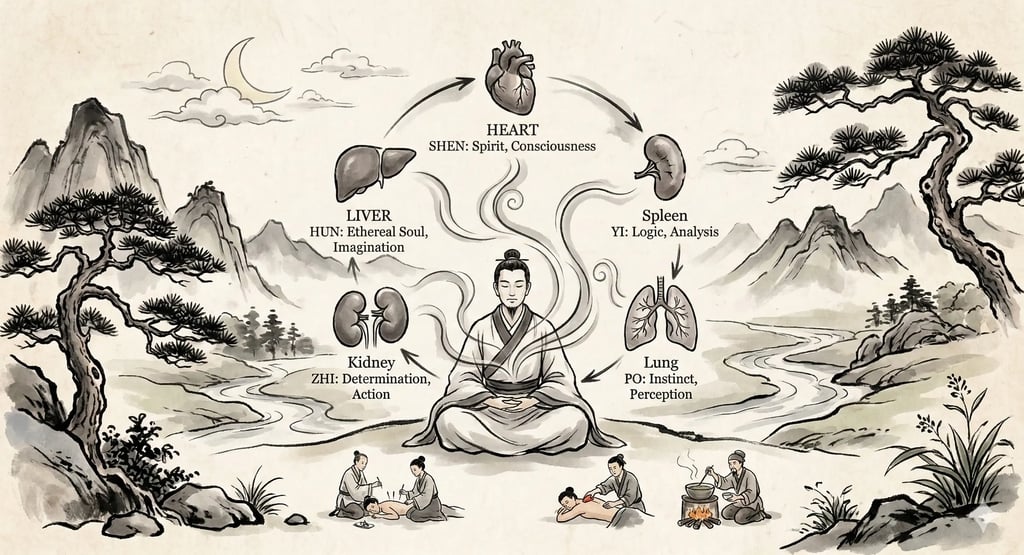 Shen (Heart): Governs information recognition, connection, and concept formation.