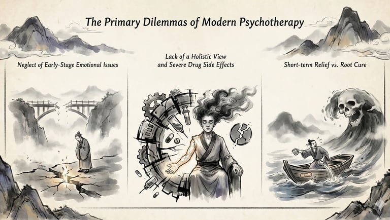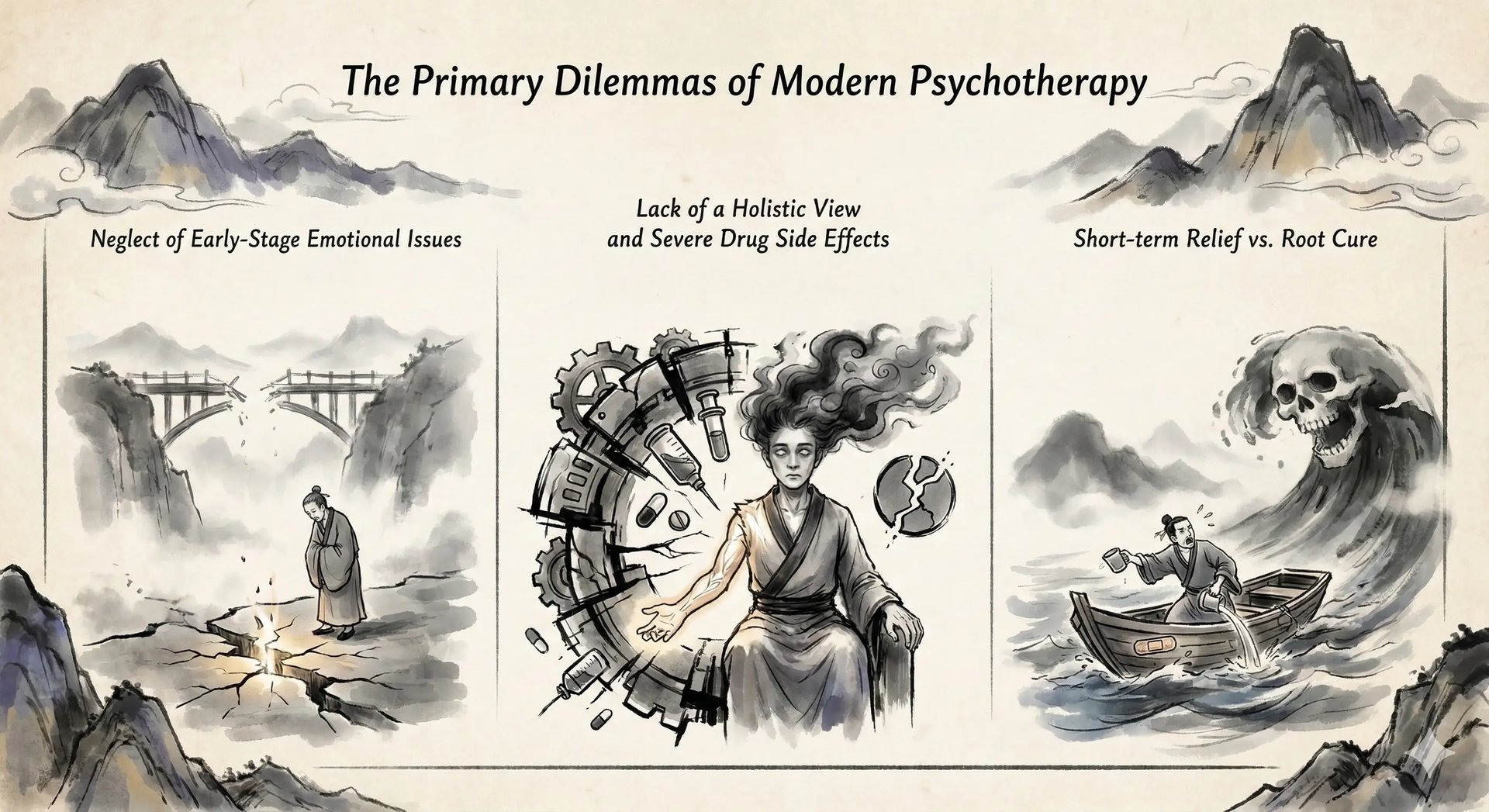 The high specialization of psychology has led to fragmented treatment. A patient treated for depression might see a reduction in physical symptoms, but may develop new issues such as cognitive dullness or a vacant gaze due to medication. This approach often overlooks the fundamental goal of psychotherapy: improving the overall quality of life.